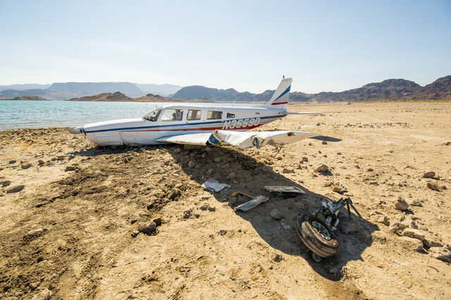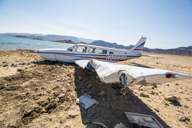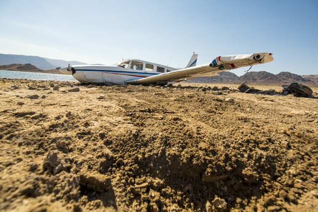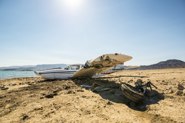 Wreckage from a downed plane rest on Boulder Beach next to Lake Mead in Boulder City, Nev. on Monday, June 22, 2015. The plane went down around 5:20am. There were four passengers on board with only minor injuries reported. (Joshua Dahl/Las Vegas Review-Journal)
