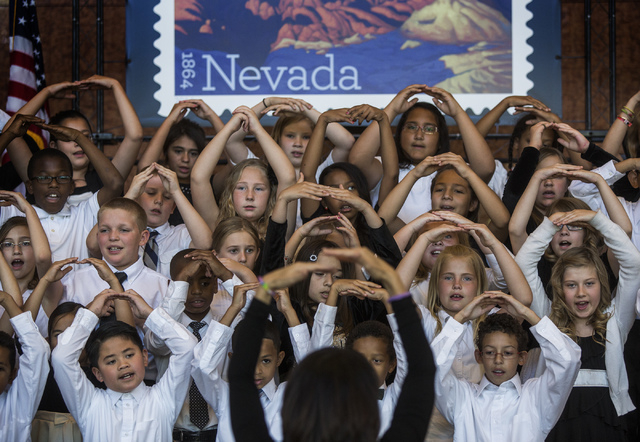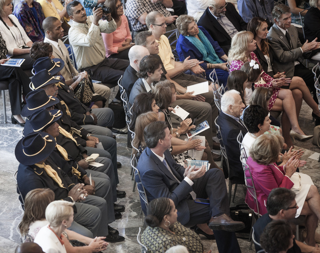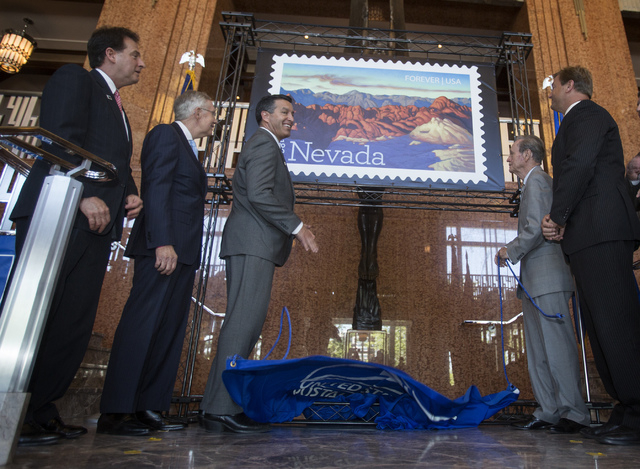 Senate Majority Leader Harry Reid, D-Nev., Sen. Dean Heller, R-Nev., and Republican Gov. Brian Sandoval were among the politicians that unveiled Nevada’s “forever stamp,” which commemorates the state’s 150th anniversary.