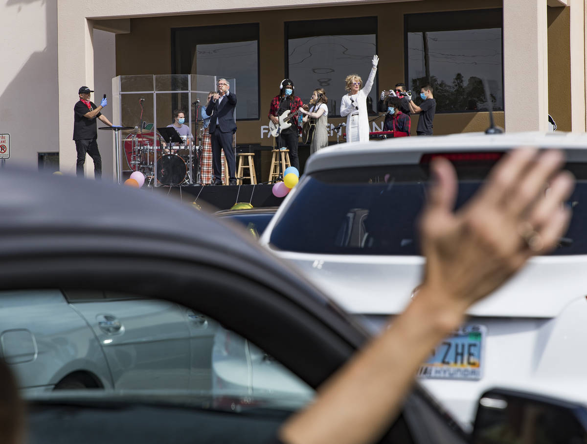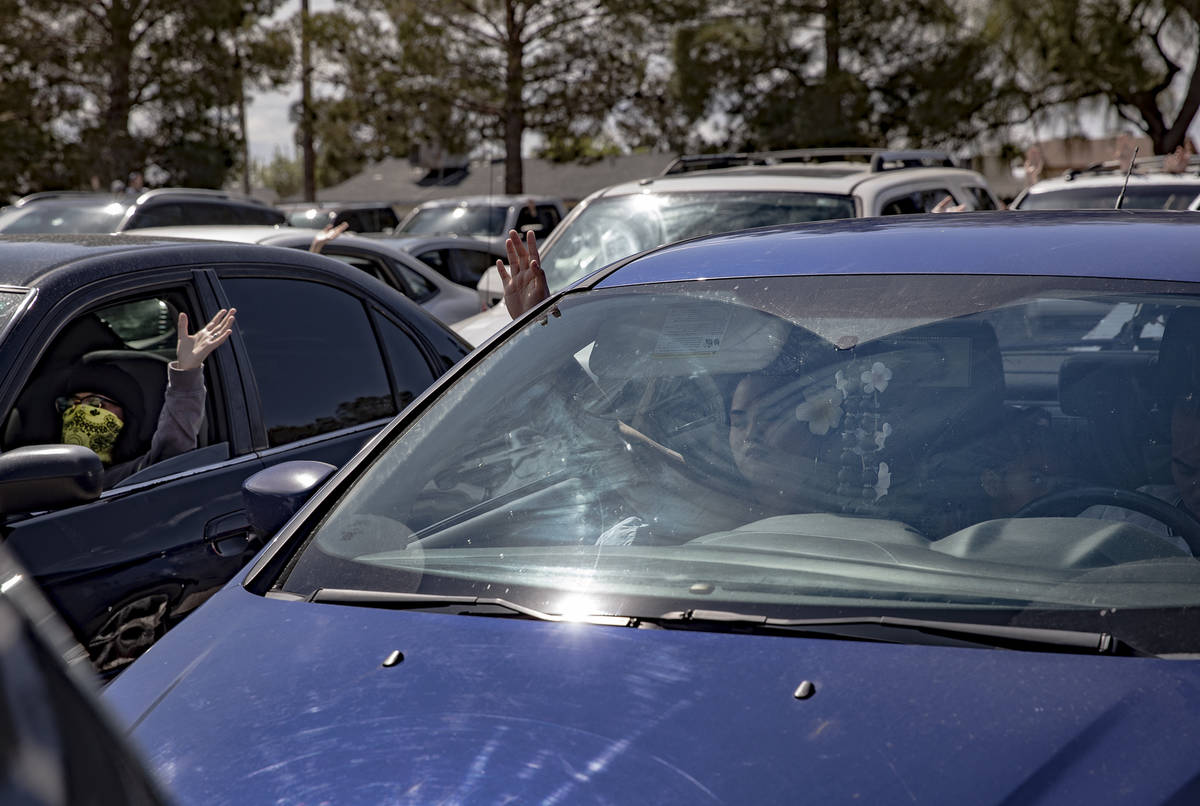 Scores of cars filled a portion of the International Church of Las Vegas parking lot Sunday morning as part of a drive-in Easter service, marking a new way to gather in the age of the novel coronavirus.