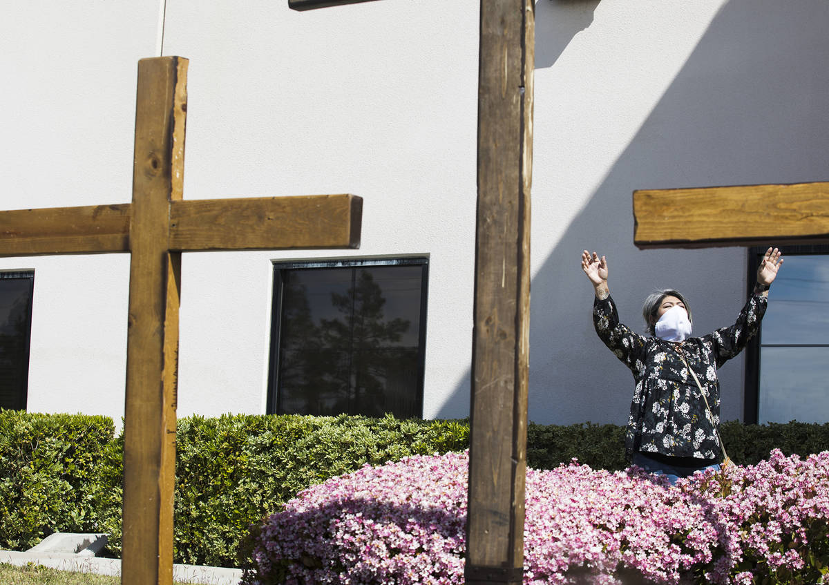 Norma Urrabazo worships from the side of the stage at an Easter service in the parking lot at International Church of Las Vegas in Las Vegas, Sunday, April 12, 2020. (Rachel Aston/Las Vegas Review-Journal) @rookie__rae