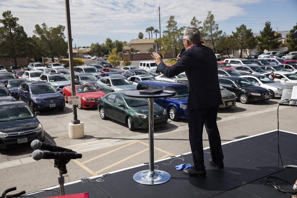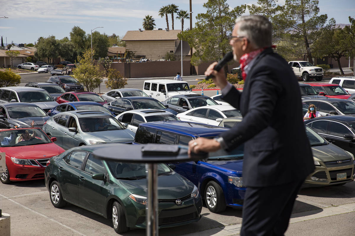 Pastor Paul Marc Goulet leads an Easter service in the parking lot at International Church of Las Vegas in Las Vegas, Sunday, April 12, 2020. (Rachel Aston/Las Vegas Review-Journal) @rookie__rae