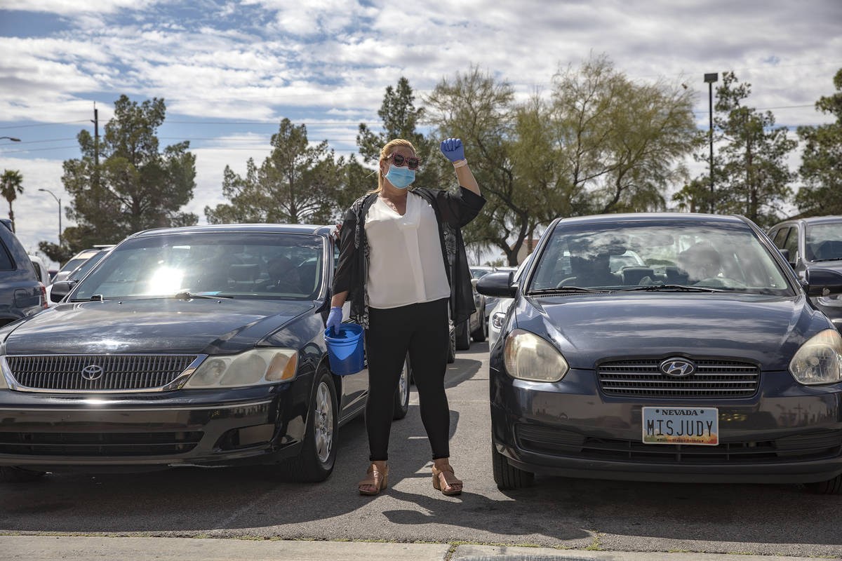 Usher Deborah Withrow worships alongside guests in their cars at an Easter service in the parking lot at International Church of Las Vegas in Las Vegas, Sunday, April 12, 2020. (Rachel Aston/Las Vegas Review-Journal) @rookie__rae