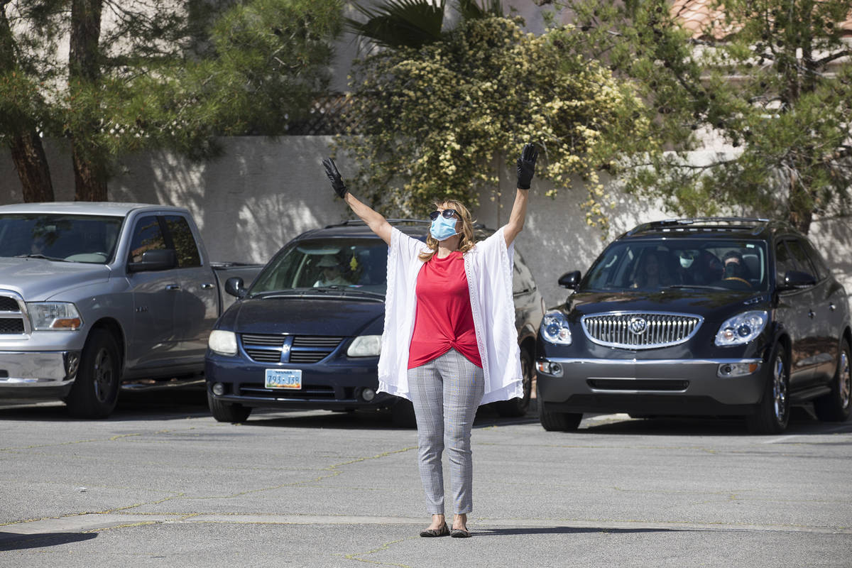 Usher Cathleen Snyder worships alongside guests in their cars at an Easter service in the parking lot at International Church of Las Vegas in Las Vegas, Sunday, April 12, 2020. (Rachel Aston/Las Vegas Review-Journal) @rookie__rae