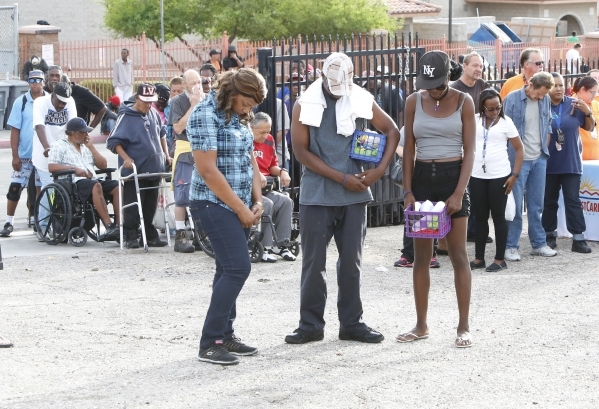 People, including LVMPD homeless liaison, Annie Wilson, left, pray after participating in the Homeless Veterans Walk in downtown Las Vegas Tuesday, Sept. 22, 2015. LVMPD joined by celebrity guests from the Life is Beautiful Music & Art Festival, homeless advocates and the City of Las Vegas for a Homeless Walk to provide services to those in need. Bizuayehu Tesfaye/Las Vegas Review-Journal Follow @bizutesfaye