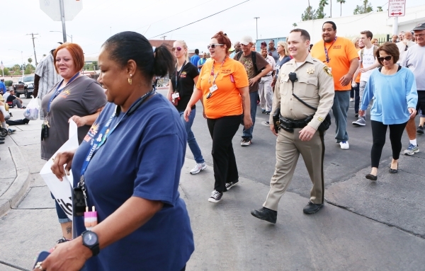 Las Vegas police officer, Ty Muncie, center right, and Leslie Farrell, center left, participated in the Homeless Veterans Walk in downtown Las Vegas Tuesday, Sept. 22, 2015. LVMPD joined by celebrity guests from the Life is Beautiful Music & Art Festival, homeless advocates and the City of Las Vegas for a Homeless Walk to provide services to those in need. Bizuayehu Tesfaye/Las Vegas Review-Journal Follow @bizutesfaye