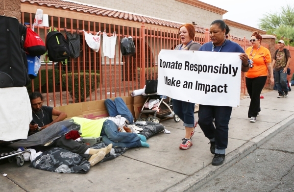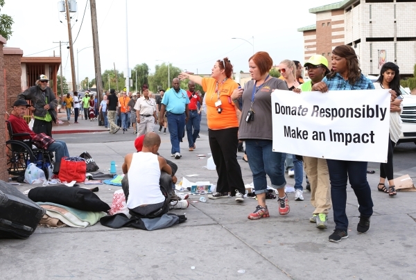Leslie Farrell, left, Morgan Schindler, second left, Tanya Page, second right, and LVMPD homeless liaison Annie Wilson, right, lead the Homeless Veterans Walk in downtown Las Vegas Tuesday, Sept. 22, 2015. LVMPD joined by celebrity guests from the Life is Beautiful Music & Art Festival, homeless advocates and the City of Las Vegas for a Homeless Walk to provide services to those in need. Bizuayehu Tesfaye/Las Vegas Review-Journal Follow @bizutes
