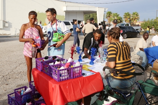 Tabitha Evens, left, and Jeremy Selby, receive toiletry basket after the Homeless Veterans Walk in downtown Las Vegas Tuesday, Sept. 22, 2015. LVMPD joined by celebrity guests from the Life is Beautiful Music & Art Festival, homeless advocates and the City of Las Vegas for a Homeless Walk to provide services to those in need. Bizuayehu Tesfaye/Las Vegas Review-Journal Follow @bizutesfaye