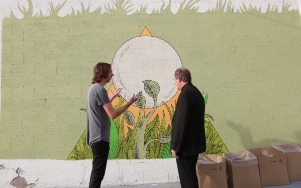 Father Courtney Edward, right, listens to local Las Vegas artist, Alex Lilley, left, as he talks about his mural after the Homeless Veterans Walk in downtown Las Vegas Tuesday, Sept. 22, 2015. LVMPD joined by celebrity guests from the Life is Beautiful Music & Art Festival, homeless advocates and the City of Las Vegas for a Homeless Walk to provide services to those in need. Bizuayehu Tesfaye/Las Vegas Review-Journal Follow @bizutesfaye