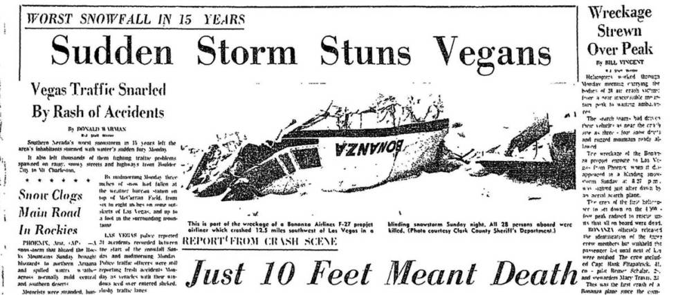 A Bonanza F-27 Silverdart flying into Las Vegas from Phoenix crashed in the Bird Springs Ranch near Goodsprings after Southern Nevada experienced its worst blizzard in 15 years.