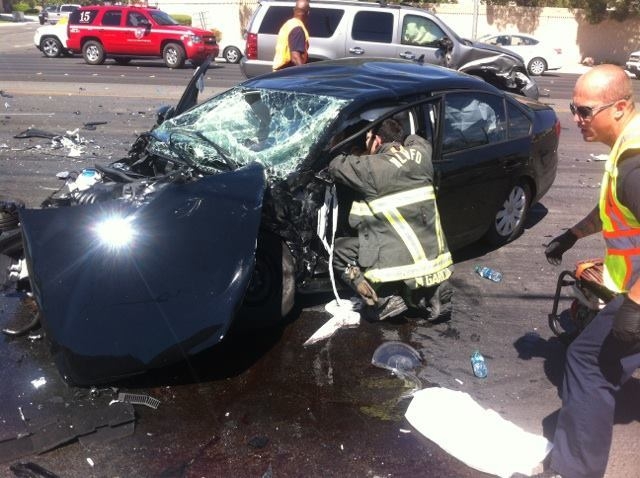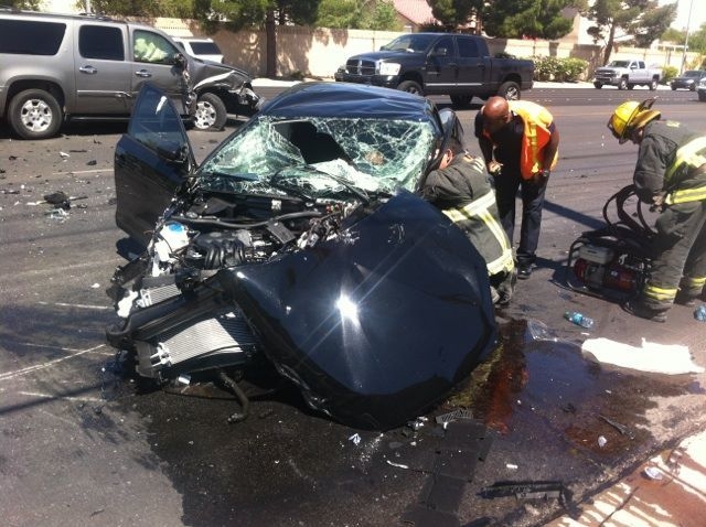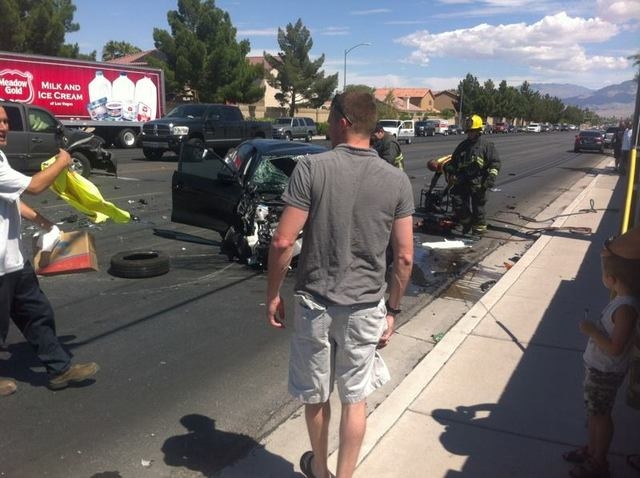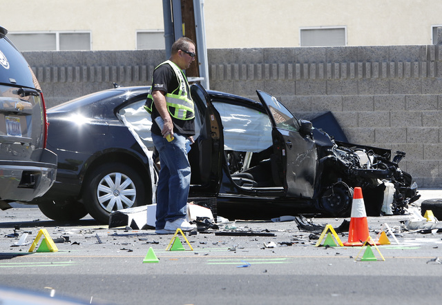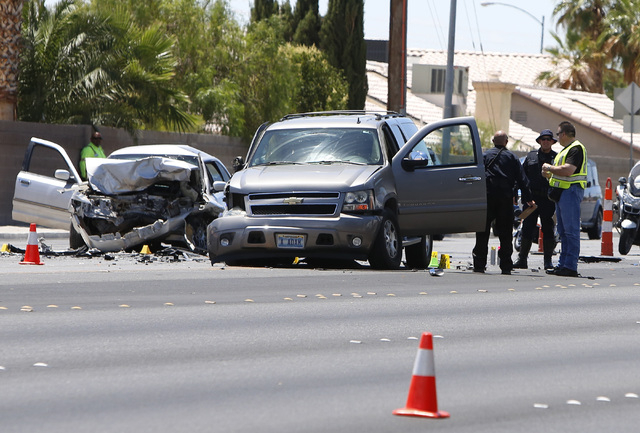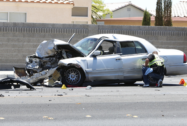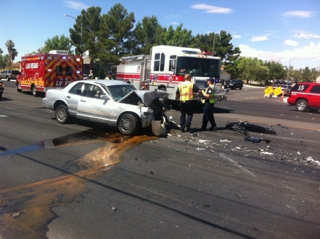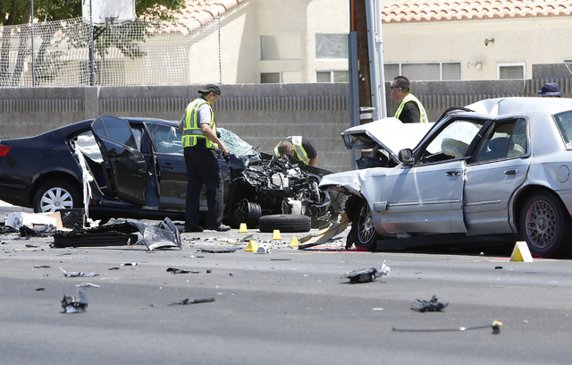 The crash happened about 10:20 a.m. on Decatur. A car traveling south on Decatur hit an SUV and a sedan while changing lanes, police said.