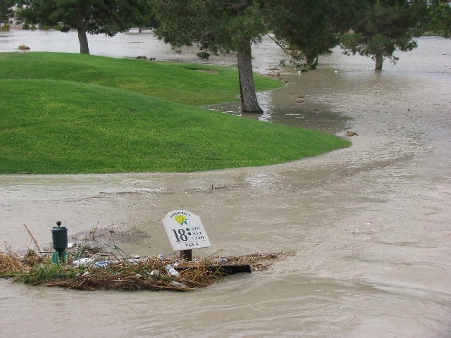 Clark County Commissioner Chris Giunchigliani said the flooding was due to the amount of rain and to the fact that the Las Vegas Wash and the Flamingo Wash converge at the golf course, doubling the amount of water rushing through one place.