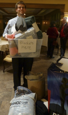 DT/LV Dynamos Coordinator Riley Foley collects blankets to benefit the Nevada Rescue Mission during the Downtown Dynamos Holiday Mixer at JW Marriott Las Vegas Dec. 16. More than 50 attendees enjoyed complimentary appetizers, drink specials and raffle prizes valued at $50 from the JW Marriott’s Spa Aquae and Irish Pub, J.C. Wooloughan's. Notable guests included executives from the City of Las Vegas, Zappos.com, Inc., United Way of Southern Nevada, Consulate of Mexico in Las Vegas, NV and others from the local business community. In addition to spreading holiday cheer, guests donated numerous blankets to benefit the Nevada Rescue Mission. For more information, visit t www.marriott.com/LASJW.