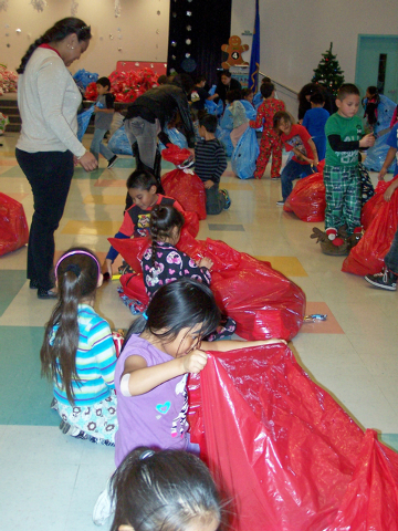 Las Vegas Hospitality Association's Fill A Bag With Cheer operation involves volunteers adopting children in need. This year, 337 kindergarten, first and second graders at Arturo Cambeiro Elementary School have been adopted and received receive jumbo bags filled with shoes and socks, a coat, a sweater or shirt,