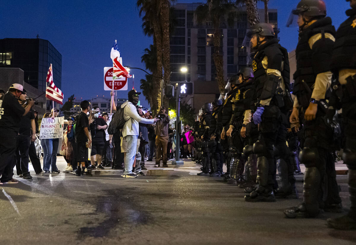 Protesters face off against Las Vegas police during a protest against ICE on Wednesday, June 11 ...