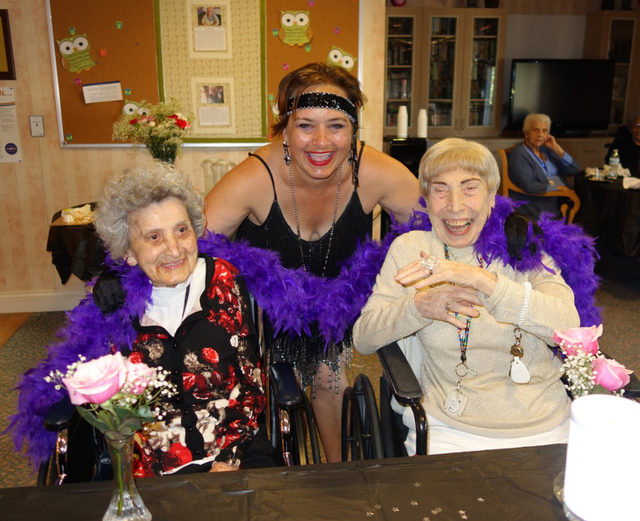 Balloons decorated the activities room, and lemonade and a cupcake cake were served. Songs were provided by local entertainer Brenda Hebert, dressed as a flapper. With her fringe flying, Hebert asked the audience to join her in songs from Broadway and the Great American Songbook.