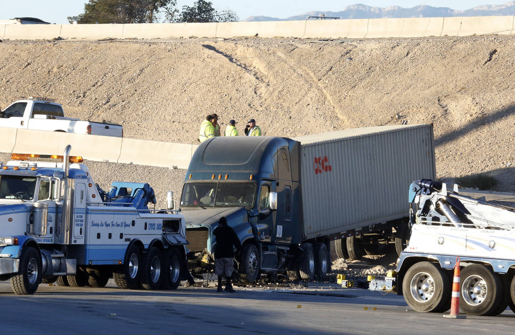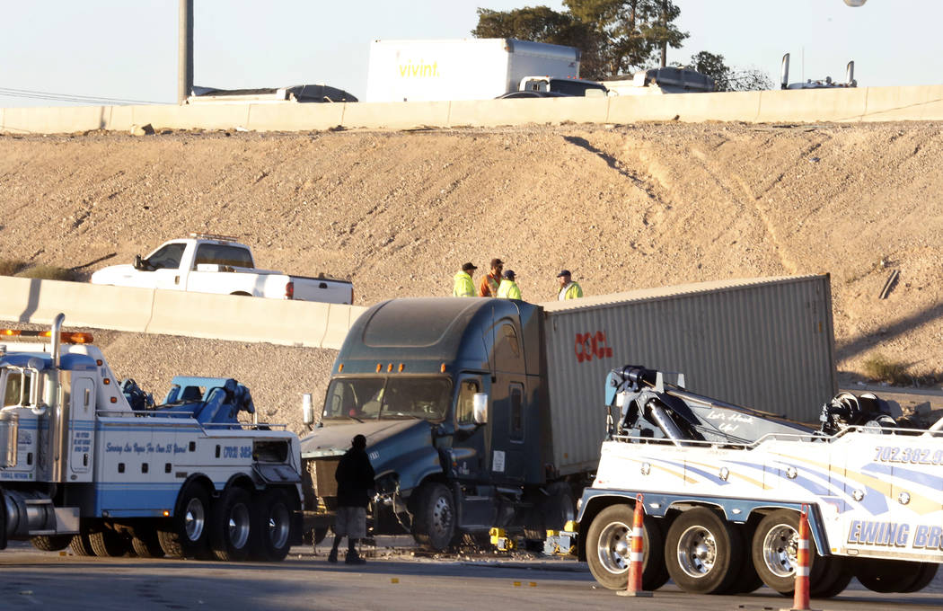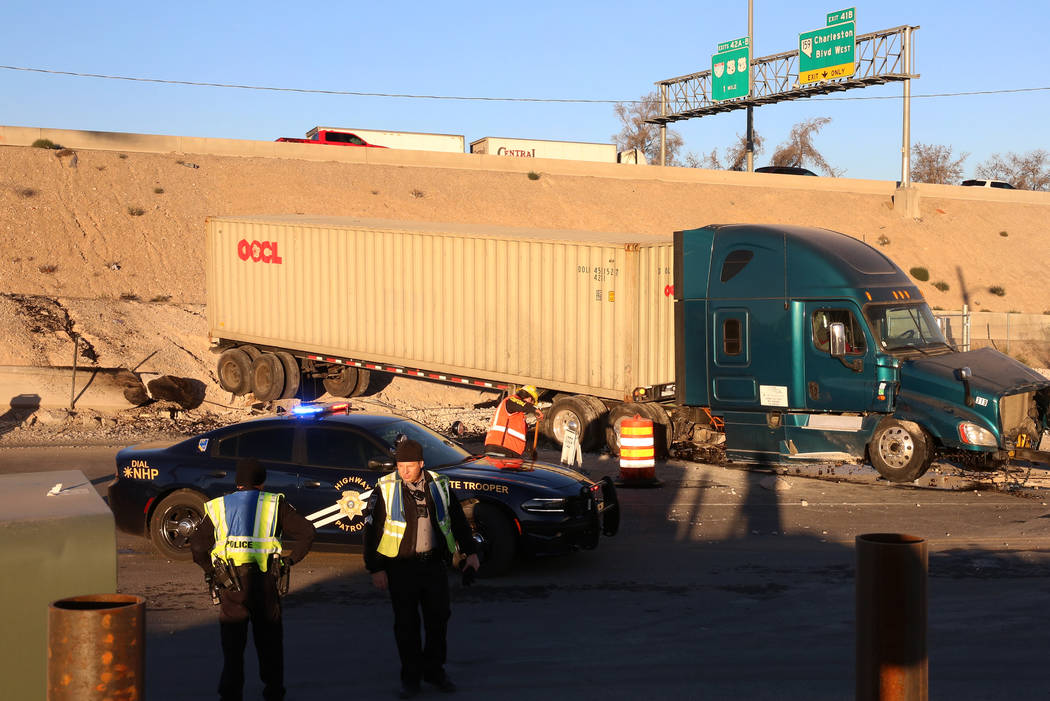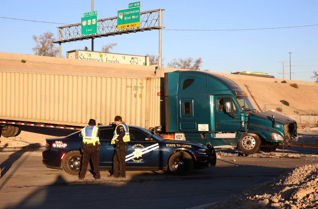 The Nevada Highway Patrol is investigating a semitrailer crash on Wednesday, Dec. 13, 2017, in Las Vegas. A semitrailer crashed into a dirt area on the eastbound Charleston off-ramp of northbound Interstate 15. (Bizuayehu Tesfaye/Las Vegas Review-Journal) @bizutesfaye