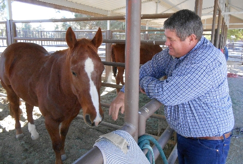 Securing the animals is Mark Milford's job. When not tending his automotive shop, he is a professional rodeo competitor with a history of ranching. Two of his horses, Bomber and Ed, have been part of the live Nativity production since the Las Vegas Redrock Stake took over the show about five years ago.