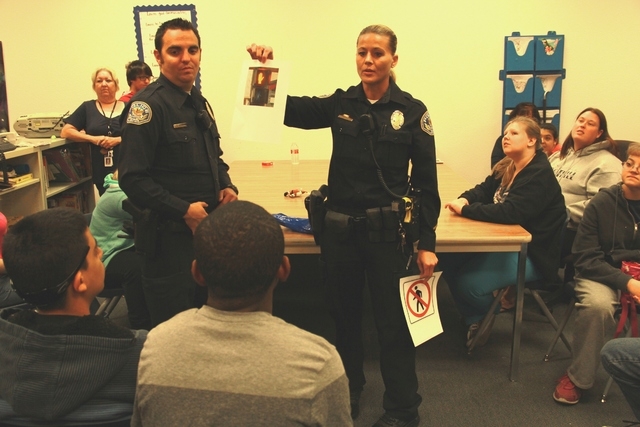Standing on the corner of Heather and College drives, Henderson police officer Russell Adams instructs a group of Foothill High School special needs students on crosswalk safety before sending them to cross with his partner, officer Lindsay Vukanovich.