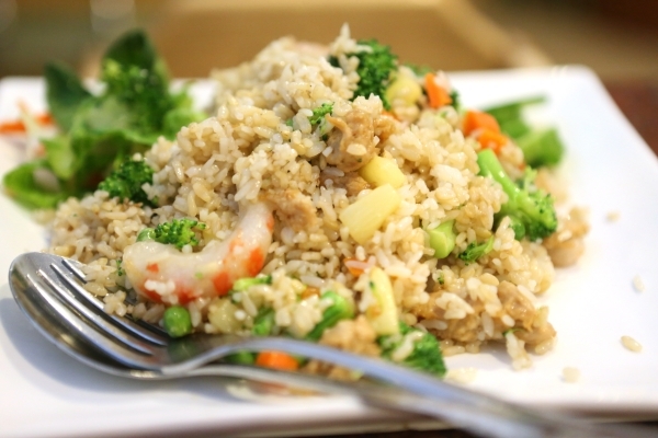 The house fried rice ($9.95) is made with pineapple, peas, veggie ham and realistic-looking faux shrimp (egg optional).
