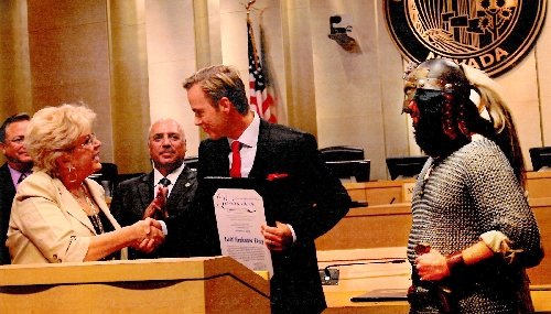 "Leif discovered America and beat Columbus to it by 500 years," said Erik Pappa, president of the lodge. "He and his 35 men displayed remarkable bravery and courage in crossing the ocean to get here. While the holiday (Leif Erikson Day, Oct. 9) has significance for the 52,000 Scandinavians who call the Las Vegas Valley home, everyone can take pride in Leif's triumph, which has inspired generations of Americans."