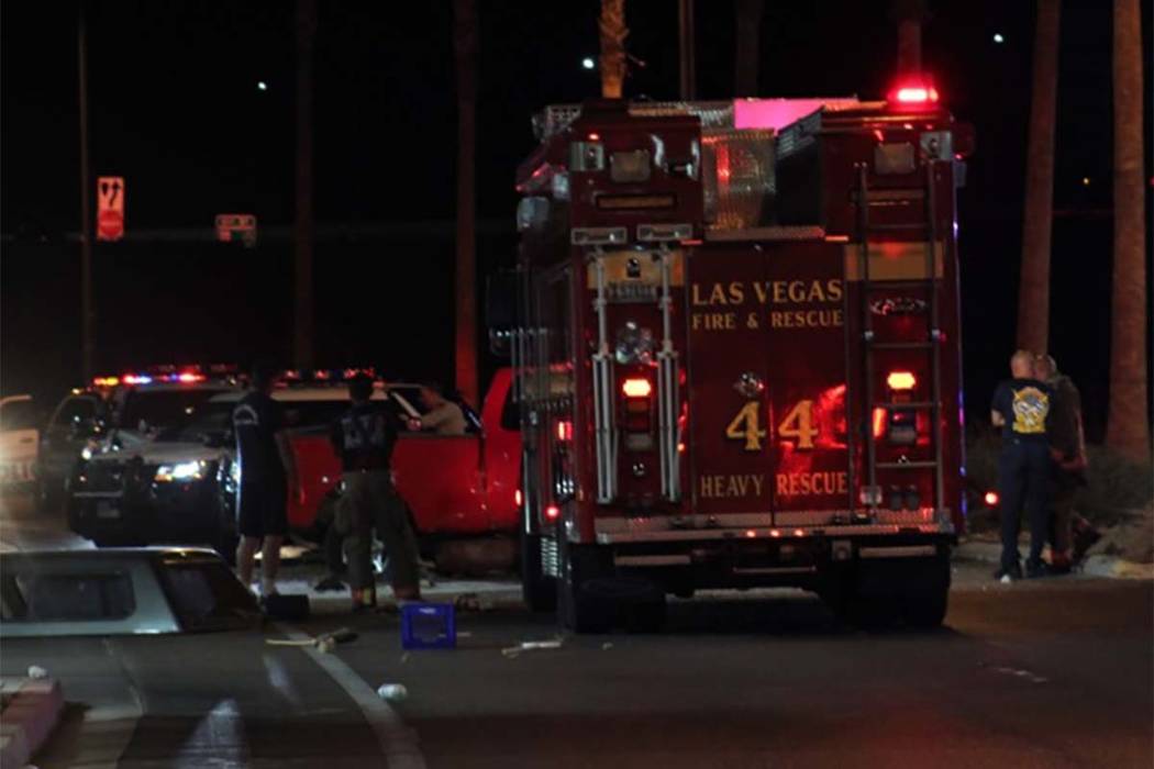 At 5:30 a.m. police and emergency crews blocked Centennial Center Boulevard between Grand Montecito and Oso Blanca Road, where the damaged red pickup sat near the median.