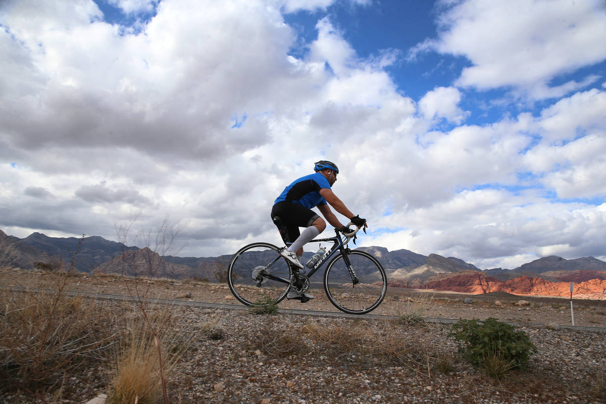 A cyclists makes his way north on Route 159 at Red Rock Canyon in Las Vegas, Saturday, March 21, 2020. (Erik Verduzco / Las Vegas Review-Journal) @Erik_Verduzco