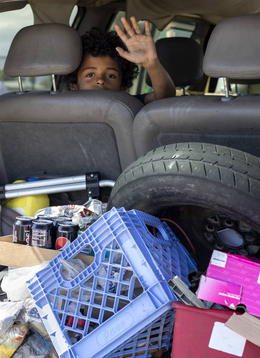 Eight-year-old Masen Flowers waves out of his mother’s van as they drive through a food bank hosted by The Just One Project outside Hyde Park Middle School on Saturday, March 21, 2020, in Las Vegas. (Ellen Schmidt/Las Vegas Review-Journal) @ellenkschmidt_