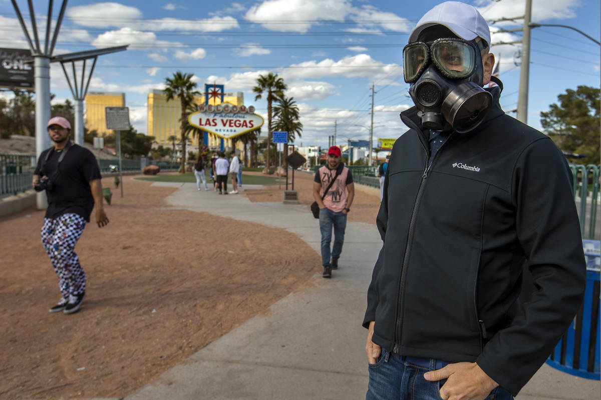 Gerard Moreno makes a stop at the "Welcome to Fabulous Las Vegas Nevada" sign amid a shutdown of casinos along the Las Vegas Strip due to coronavirus on Saturday, March 21, 2020. (L.E. Baskow/Las Vegas Review-Journal) @Left_Eye_Images