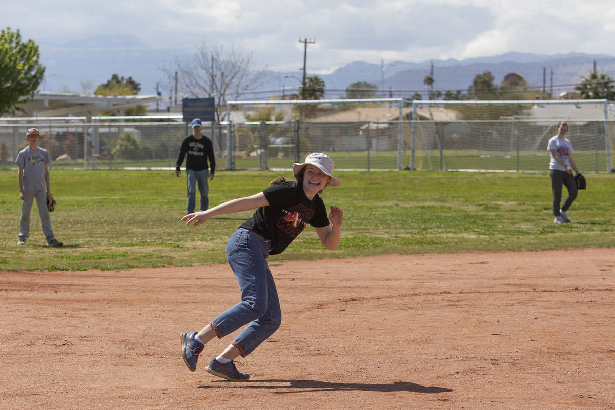 Rosina Gillette heads back to second base after the third baseman caught the ball at Beazer Homes Hyde Park on Saturday, March 21, 2020, in Las Vegas. Her family decided to enjoy the weather during their period of social distancing. (Ellen Schmidt/Las Vegas Review-Journal) @ellenkschmidt_