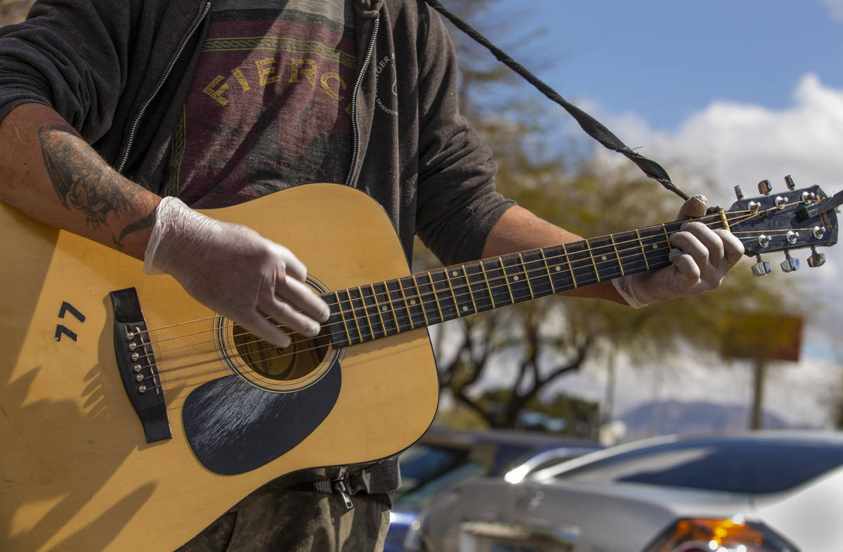 Street musician Kurtis "ToeJam" Nelson plays with plastic gloves on for safety when receiving tips from drivers at the intersection of Las Vegas Boulevard South and East Charleston Avenue Friday, March 20, 2020, in Las Vegas. (L.E. Baskow/Las Vegas Review-Journal) @Left_Eye_Images