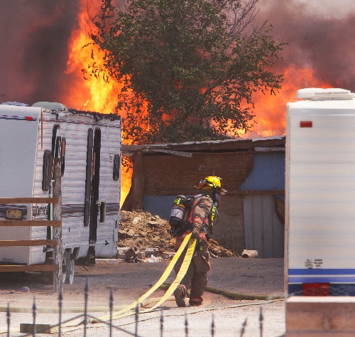 Welling said 55 Clark County firefighters responded to the fire, which began in a shed and spread to several vehicles. Las Vegas and North Las Vegas firefighters also assisted.