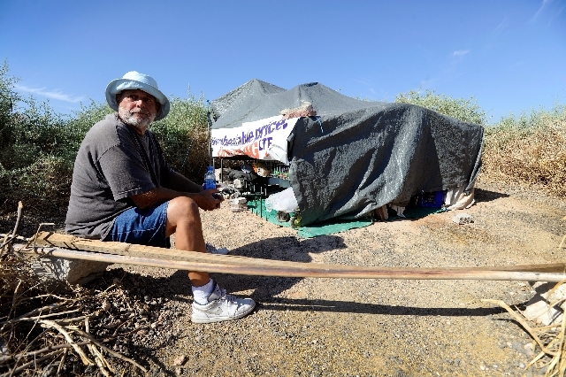 Brown was one of about 10 homeless people living at the encampment. Some emerged from their tents when they heard Torres, a homeless services program manager at HELP of Southern Nevada. The nonprofit sends caseworkers throughout Clark County year-round with water bottles. Their purpose: to engage the homeless and maybe convince them to seek help with finding permanent housing.
