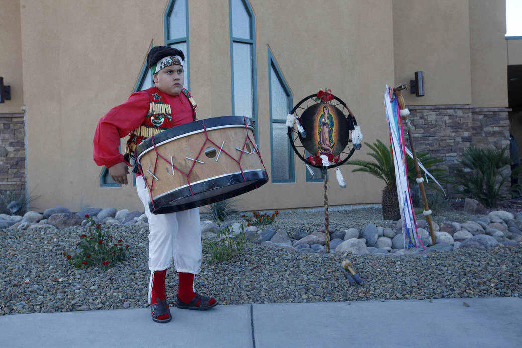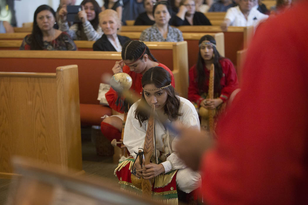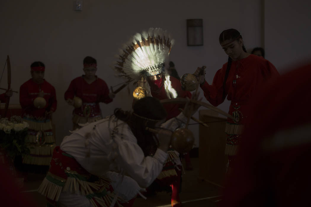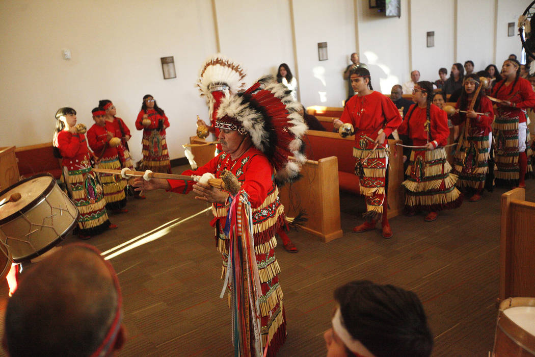 On Sunday, their drums sent a thunderous boom that could be felt throughout the chapel. Dancers in red and white clothing shook gourds and bamboo sticks that Gilcrease grew.