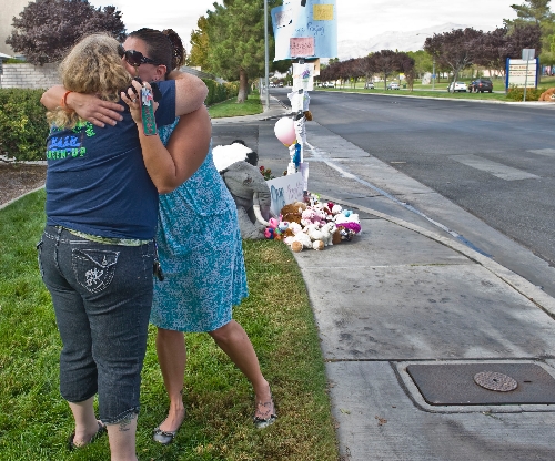 Nearby, a makeshift memorial of stuffed animals, roses and letters decorated the post of a crosswalk sign at Camino Eldorado and Bent Arrow Drive.