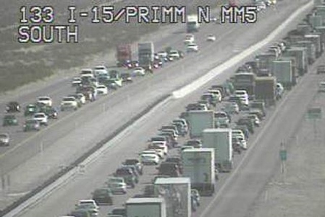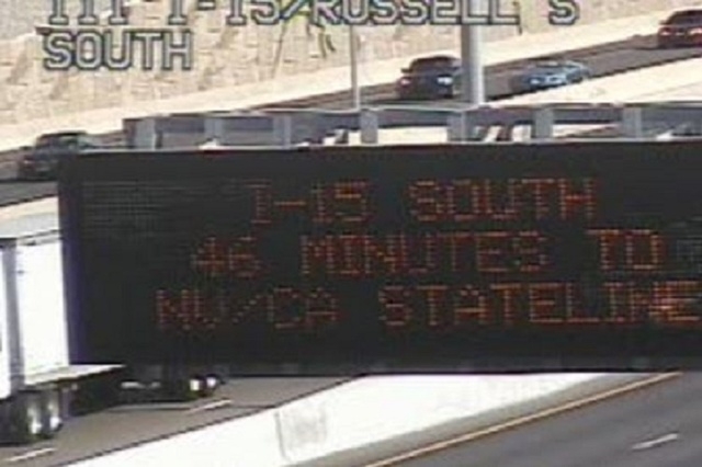 An electronic sign showed that driving from Russell Road to the California state line set drivers back 45 minutes and the I-15 south at Primm looked like a parking lot with bumper-to-bumper traffic.