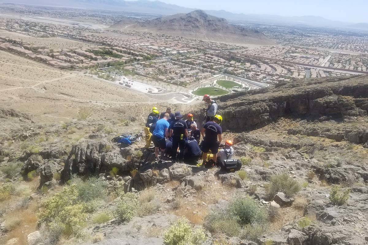 Firefighters responded around 9:30 a.m. Sunday to rescue the hiker, who suffered a fractured leg and head injury after falling on a mountain just west of Las Vegas, the department said.