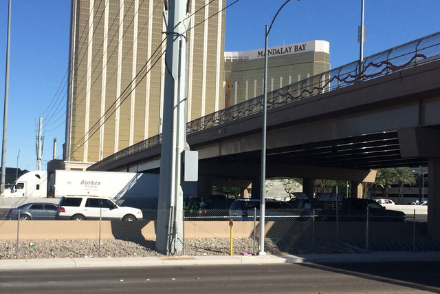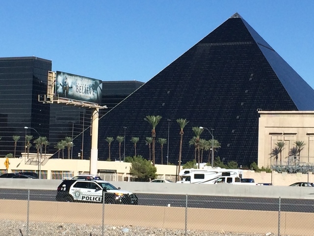 Metro police investigate a suspicious package on southbound Interstate 15, in the 3300 block of Hacienda Avenue and Dean Martin Drive, near the Hacienda overpass. Southbound lanes on I-15 are closed at Tropicana Avenue and traffic is being diverted. (Bizu Tesfaye/Las Vegas Review-Journal)