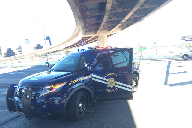 A Nevada Highway Patrol trooper is shown near the closure of southbound Interstate 15 at Tropicana Avenue. Law enforcement officials are investigating a suspicious package found along the roadway. (Bizu Tesfaye/Las Vegas Review-Journal)