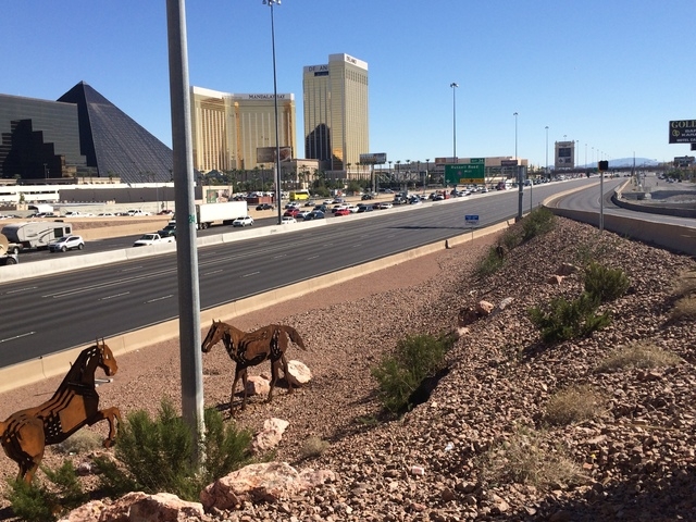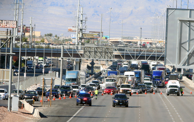 Southbound lanes on I-15 are closed at Tropicana Avenue and traffic is being diverted as Metro police investigate a suspicious package on southbound Interstate 15, in the 3300 block of Hacienda Avenue and Dean Martin Drive, near the Hacienda overpass, on Oct. 2, 2014. (Bizu Tesfaye/Las Vegas Review-Journal)