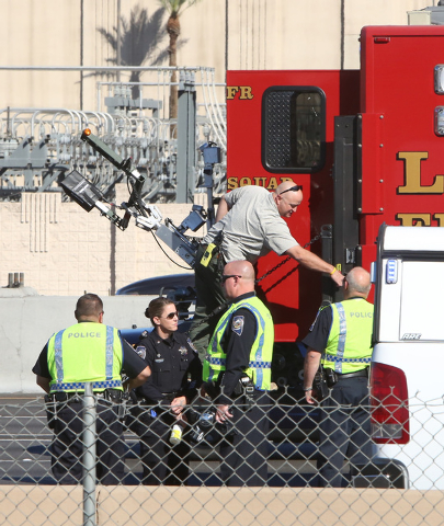 Member of the Las Vegas Fire & Rescue Bomb Squad adjusts the bomb sniffing robot as metro police investigate a suspicious package on southbound Interstate 15, in the 3300 block of Hacienda Avenue and Dean Martin Drive, near the Hacienda overpass, on Oct. 2, 2014. Southbound lanes on I-15 are closed at Tropicana Avenue and traffic is being diverted. (Bizu Tesfaye/Las Vegas Review-Journal)