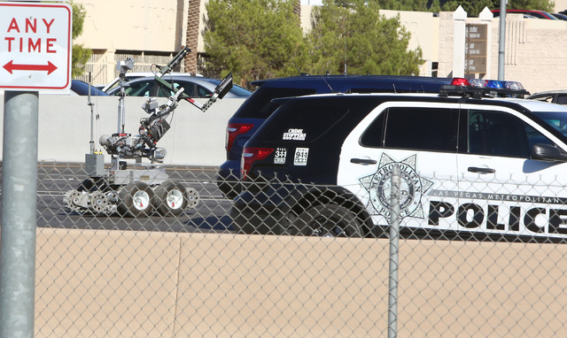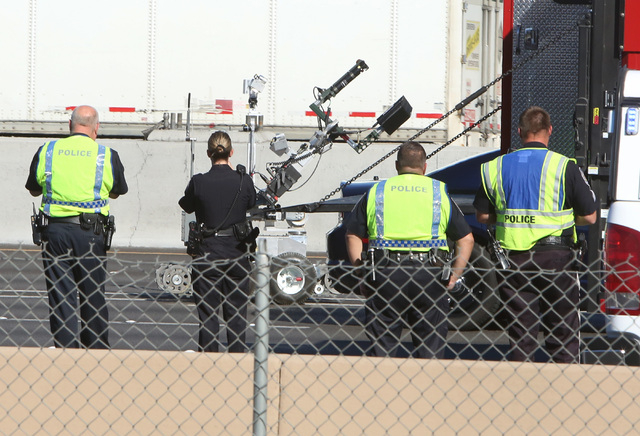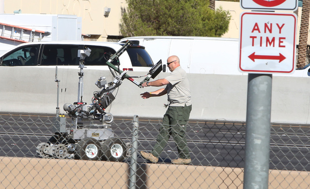 Bomb sniffing robot navigates through I-15 South where metro police investigate a suspicious package on southbound Interstate 15, in the 3300 block of Hacienda Avenue and Dean Martin Drive, near the Hacienda overpass, on Oct. 2, 2014. Southbound lanes on I-15 are closed at Tropicana Avenue and traffic is being diverted. (Bizu Tesfaye/Las Vegas Review-Journal)