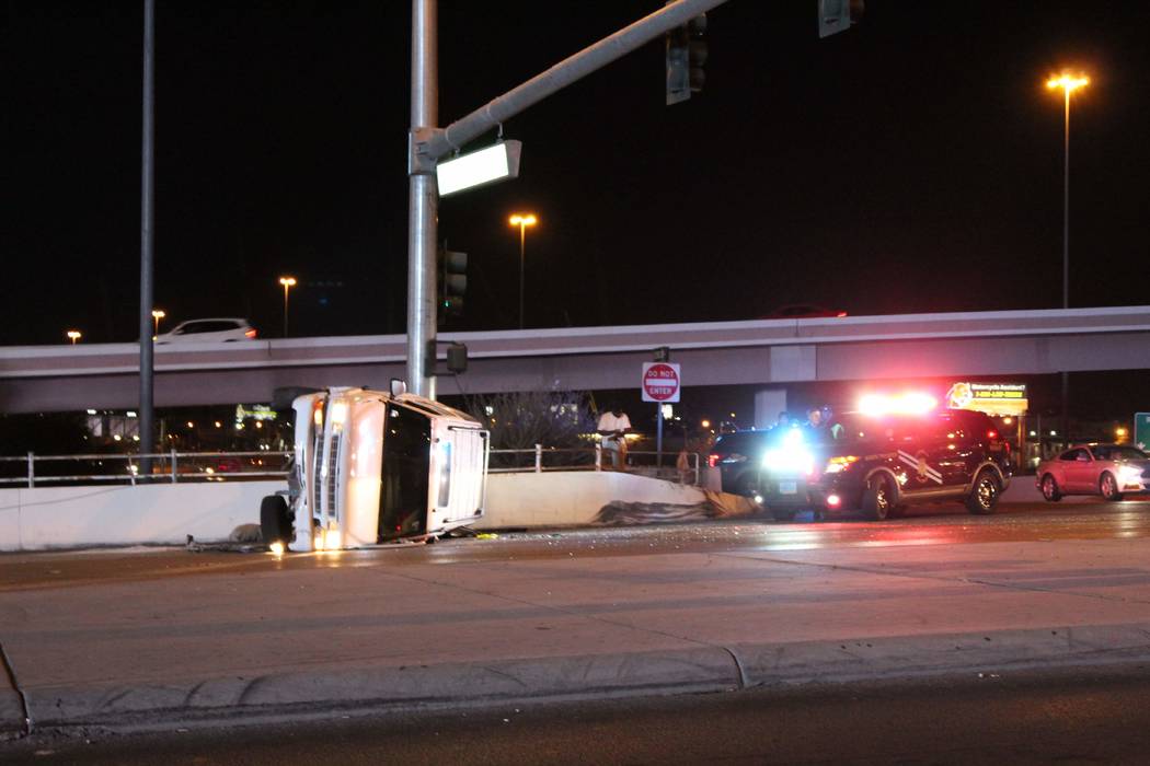 Troopers at the scene blocked one right lane of the offramp and one right lane of Tropicana, where a white SUV sat on its side. Injuries were reported in the crash.