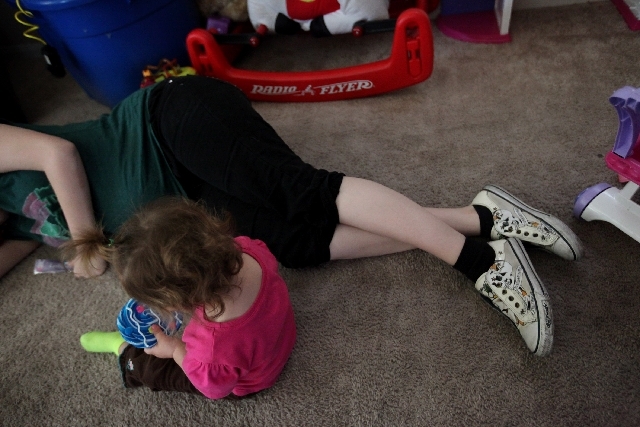 A newborn baby cries in the living room, and toddlers wander through the house.