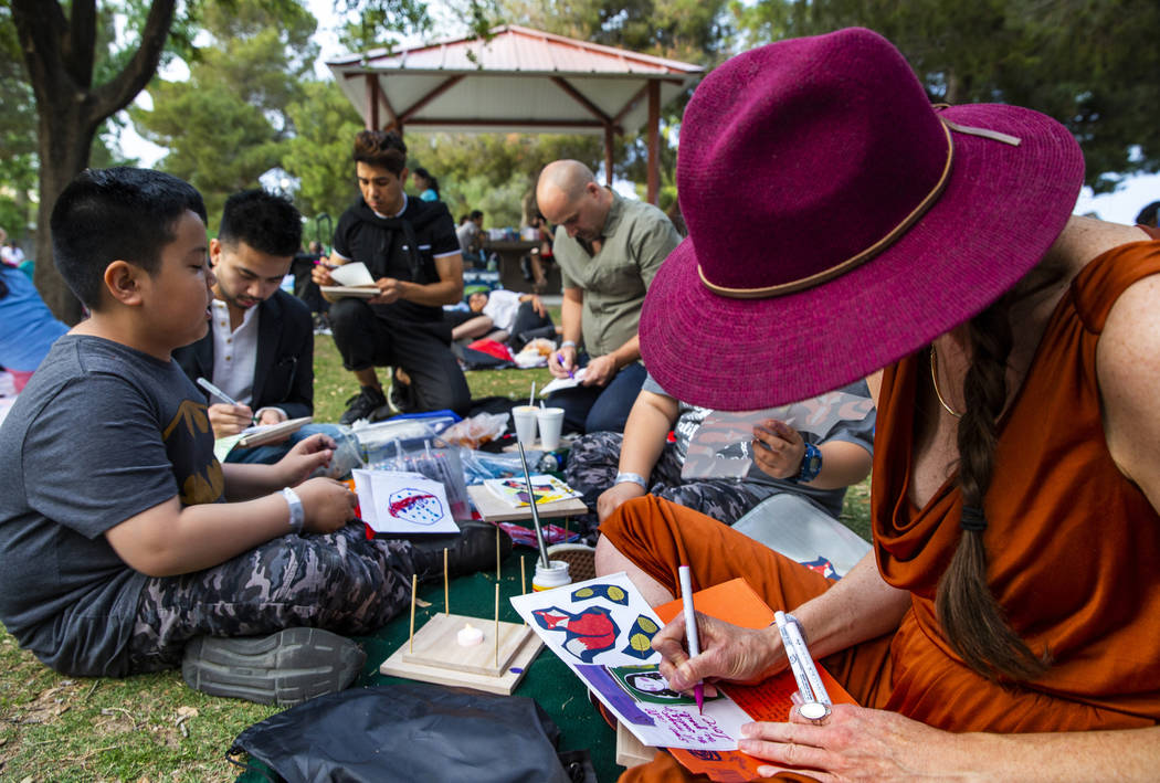 Charlotte Fox and friends decorate their lanterns during the Water Lantern Festival at Sunset Park on Saturday, April 20, 2019 in Las Vegas. (L.E. Baskow/Las Vegas Review-Journal) @Left_Eye_Images