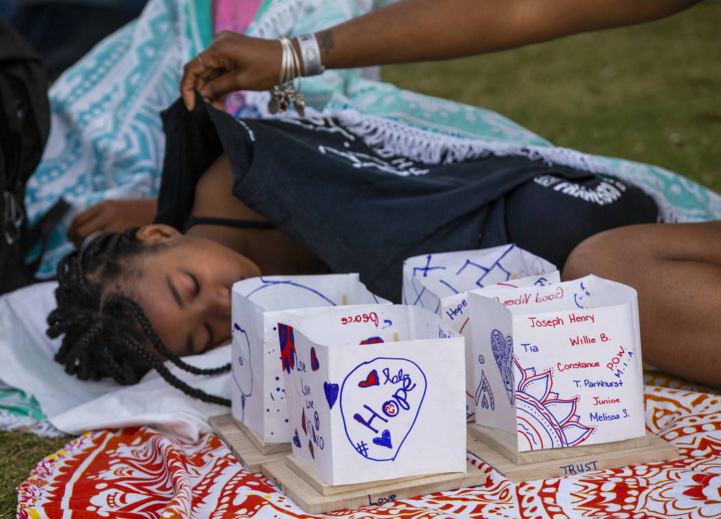 Jaiden Hammett, 10, is covered up for a quick nap before the floating starts during the Water Lantern Festival at Sunset Park on Saturday, April 20, 2019 in Las Vegas. (L.E. Baskow/Las Vegas Review-Journal) @Left_Eye_Images