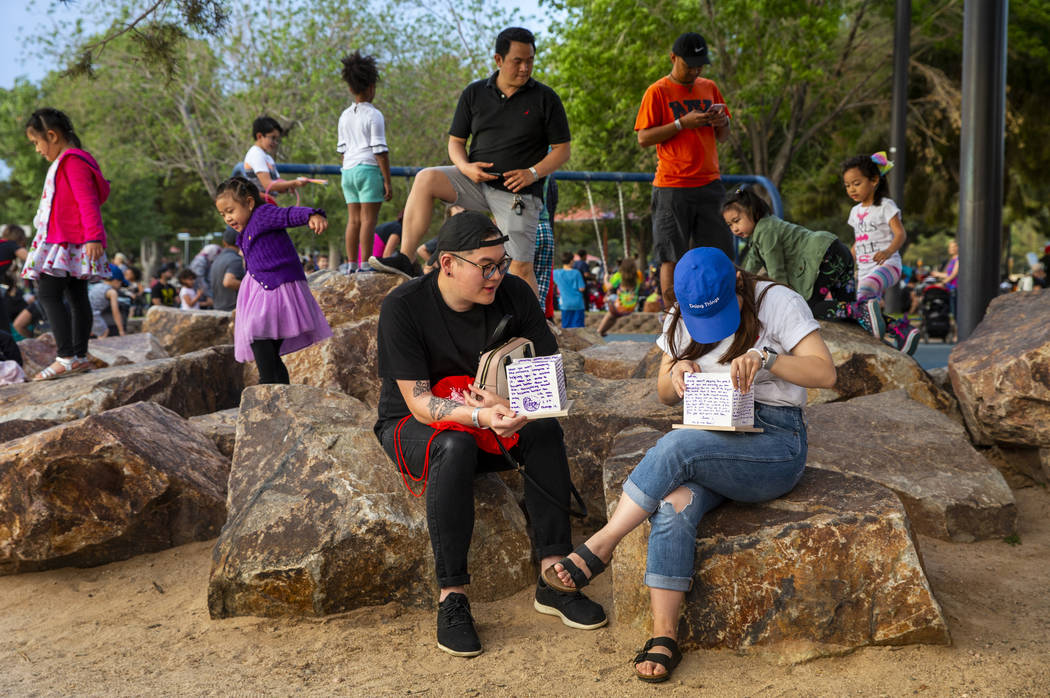 James Shoung looks on as Jennifer Nquyen constructs her lantern during the Water Lantern Festival at Sunset Park on Saturday, April 20, 2019 in Las Vegas. (L.E. Baskow/Las Vegas Review-Journal) @Left_Eye_Images