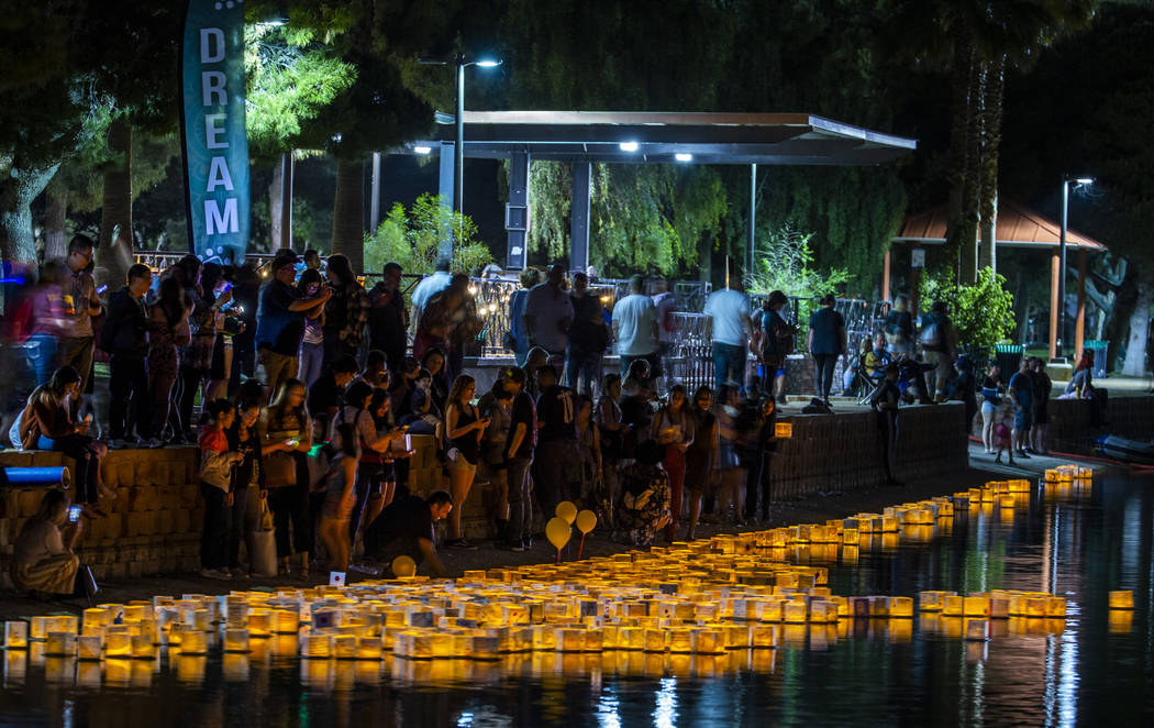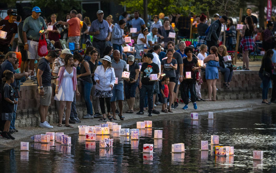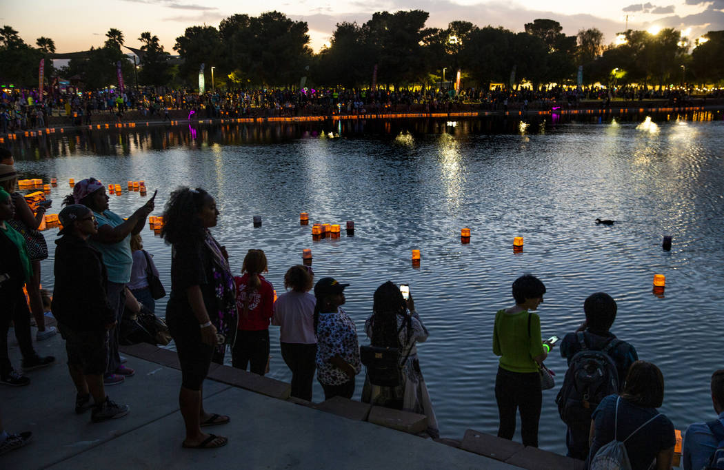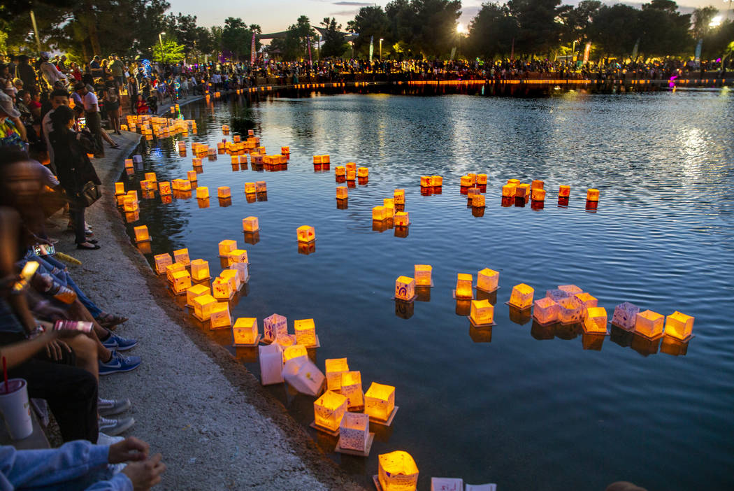 Lanterns float across the pond as people watch during the Water Lantern Festival at Sunset Park on Saturday, April 20, 2019 in Las Vegas. (L.E. Baskow/Las Vegas Review-Journal) @Left_Eye_Images
