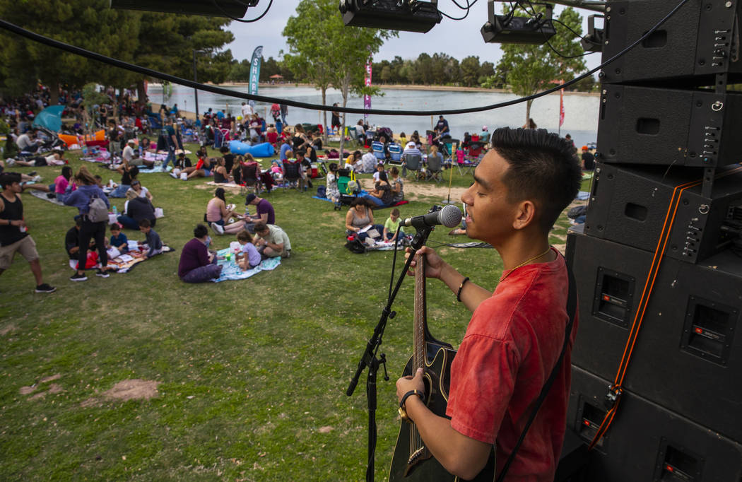 Local performer Elmer Abapo sings for the crowd as they prepare their lanterns for floating during the Water Lantern Festival at Sunset Park on Saturday, April 20, 2019 in Las Vegas. (L.E. Baskow/Las Vegas Review-Journal) @Left_Eye_Images