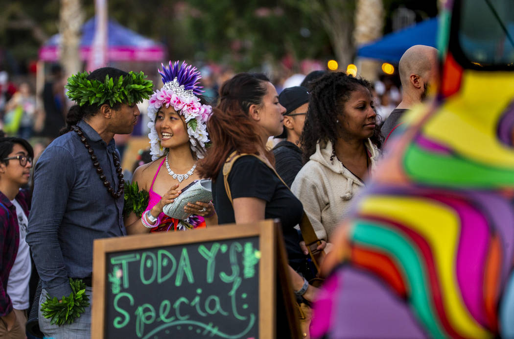 Vincent Rinaldi and Saraswati Queen Goddess join others in ordering food truck tacos during the Water Lantern Festival at Sunset Park on Saturday, April 20, 2019 in Las Vegas. (L.E. Baskow/Las Vegas Review-Journal) @Left_Eye_Images