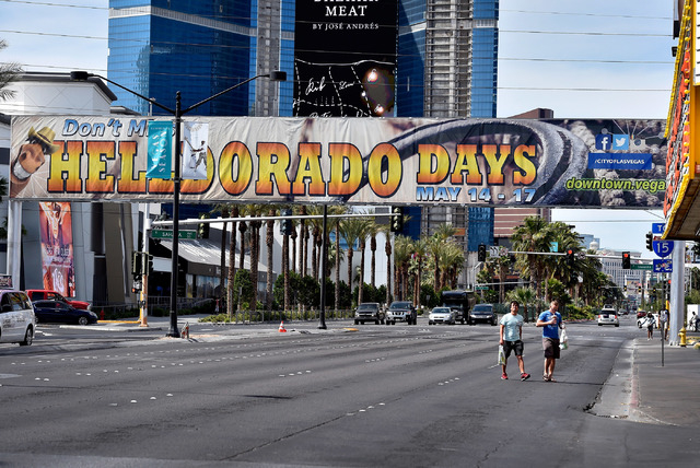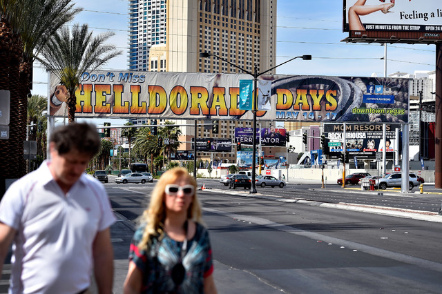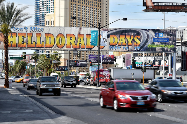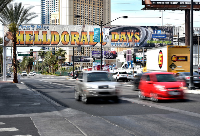 Sisolak and other commissioners say the banner — which plugs the city’s upcoming Helldorado Days rodeo on the side facing north —meets some of the criteria that recently kept them from backing legislation that would have cleared a path for commercial advertising on the Strip’s pedestrian bridges.